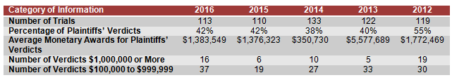 Although the number of trials has decreased from 2013 and 2014, the percentage of plaintiff verdicts is little changed. In both 2015 and 2016, 42% of the verdicts were for plaintiffs compared to 38% for plaintiffs in 2014 and 40% in 2013. These numbers are down from the 55% of the verdicts for plaintiffs in 2012.